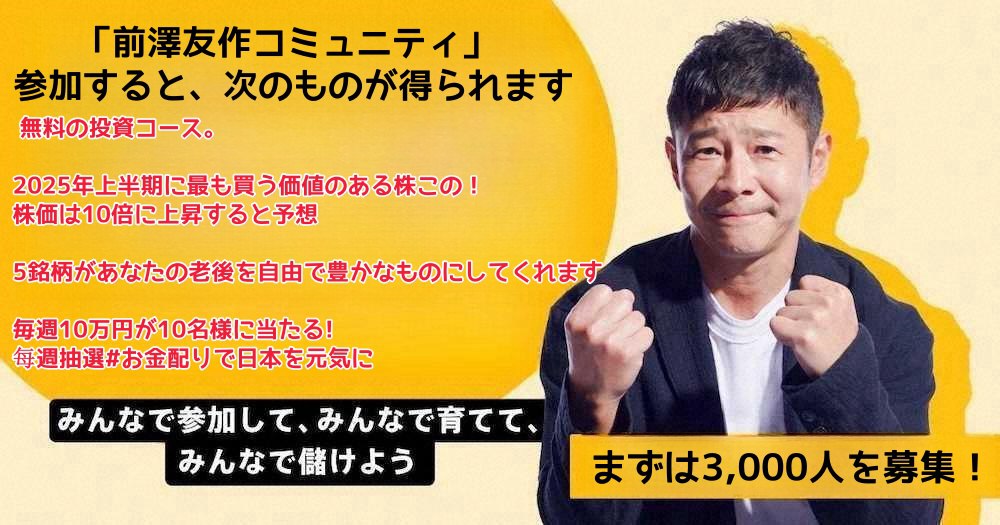 皆さんこんにちは、前澤 友作です 99%の人が気づいていないお金の正体 「貯める人ほどバカをみる!」 新時代の「稼ぎ方」と「生き方」 お金は、ただ手元に置いているだけでは増えません。 お金を増やすためには、しかるべき場所にお金を置く必要があります。 そうやってお金自体に働いてもらう必要があります。 つまり“投資"です。 株式市場で長期投資をするのが正解です。 早期退職を実現する真の解決策がここにある! 前澤 友作設立した無料の投資教室!